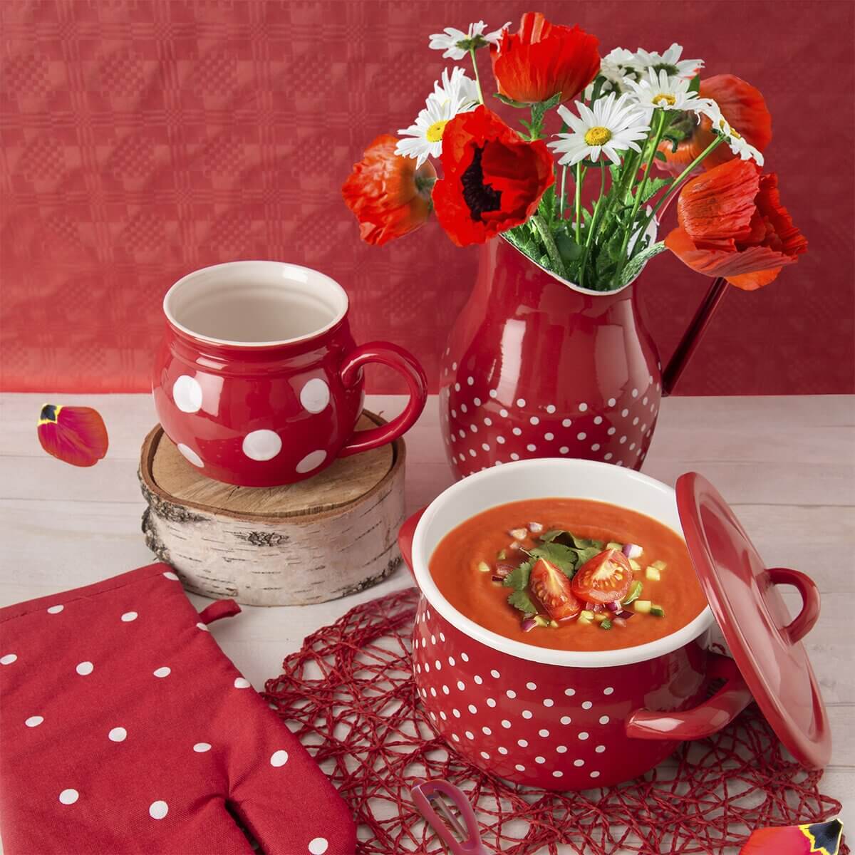 Štýlový červený džbán s bodkami, odkazujúci na roztomilý retro design, je opatrený výlevkou a uchom. Je vyrobený z kvalitného smaltovaného plechu, ktorý zaručuje dlhú dobu používania.