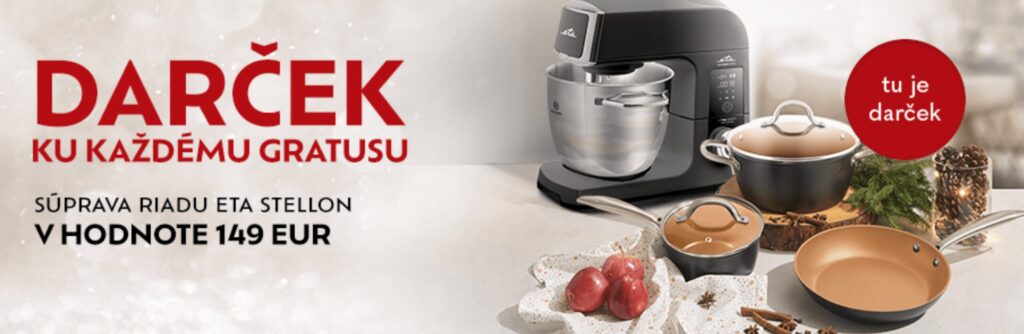 Akcia sa vzťahuje na všetky kuchynské roboty Gratus (ETA0028 / ETA0038 / ETA1028 / ETA2038 / ETA2043) zakúpené od 1. 10. 2025 do 23. 12. 2025 na e-shope prislusko.sk , alebo do vydania zásob darčekov. Registrácia je možná do 5. 1. 2026. Úplné pravidlá akcie nájdete tu.