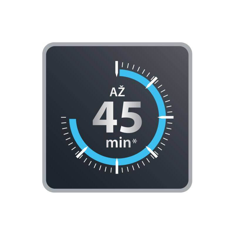 Vymeniteľná batéria poskytuje silný sací výkon s výdržou 45 minút. V prípade potreby možno zvýšiť dobu prevádzky až na 1,5 hodiny, a to dokúpením dodatočnej batérie.